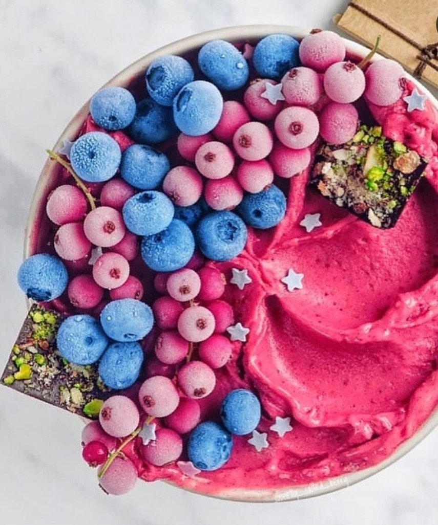 Blend all the ingredients together until it forms a creamy consistency. Serve it Immediately with some berries and nuts as a topping.