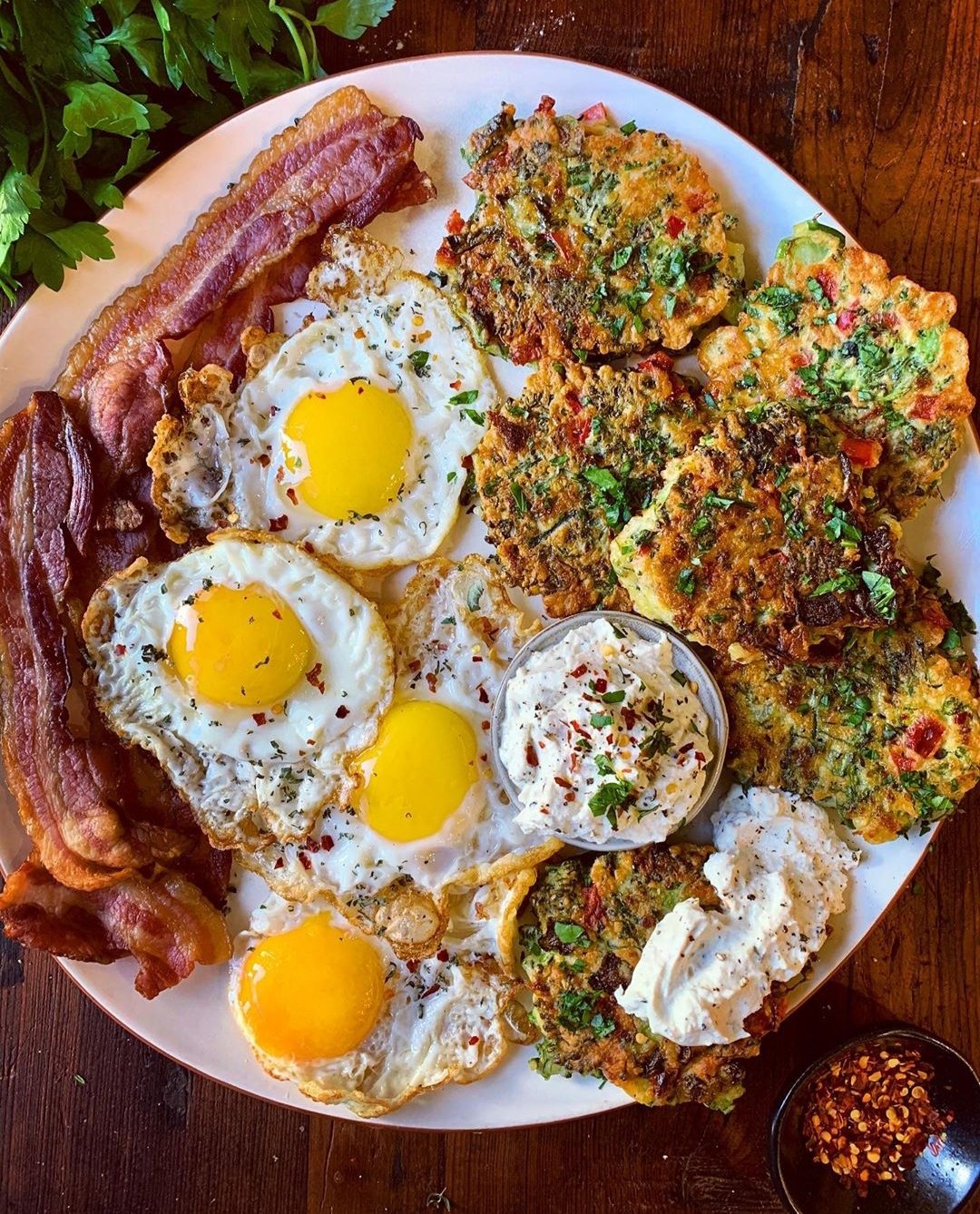 Broccolini Red Pepper Cheesy Fritters with Crispy Bacon and Fried Eggs and Peppered Ricotta veg you have into deliciously tasty little cakes that can be eaten for breakfast or dinner.